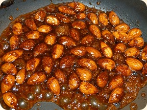 Нагреть сковороду, налить масло, добавить мед, перемешать. Добавить корицу (можно больше), имбирь; кардамон и гвоздика – молотые. Все перемешать и всыпать орехи. Готовить помешивая, пока орехи не покроются смесью из специй. Добавить сахар, по желанию ваниль. Перемешиваем пару раз и снимаем с огня.